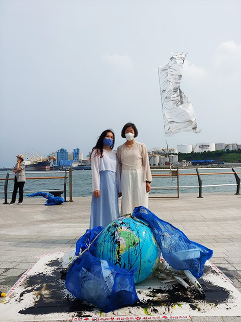 | ▲ 울산작가 윤은숙과 소정이 함께해 연안 폐기물을 모아 펼친 퍼포먼스는 지구의 환경오염에 대한 경고를 담았다. | ||