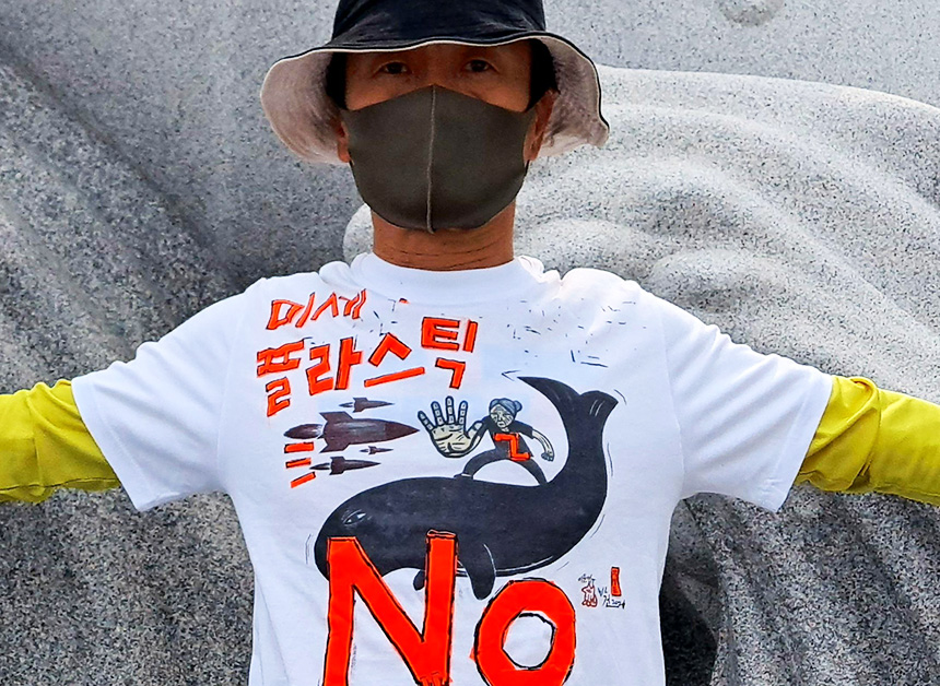 | ▲ 박건 작가는 <플라스틱,NO!!!> 옷에 그린 슬로건 그림으로 해양오염의 심각성과 고래생태에 관한 몸짓을 보여줬다. | ||